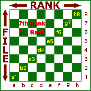 The RANKS (rows) and FILES (columns) have names. The bottom RANK is called the 1st RANK. The second RANK from the bottom is called the 2nd RANK, and so on up to the 8th RANK.