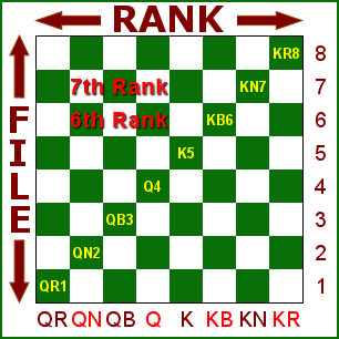 The RANKS (rows) and FILES (columns) have names. The bottom RANK is called the 1st RANK. The second RANK from the bottom is called the 2nd RANK, and so on up to the 8th RANK.